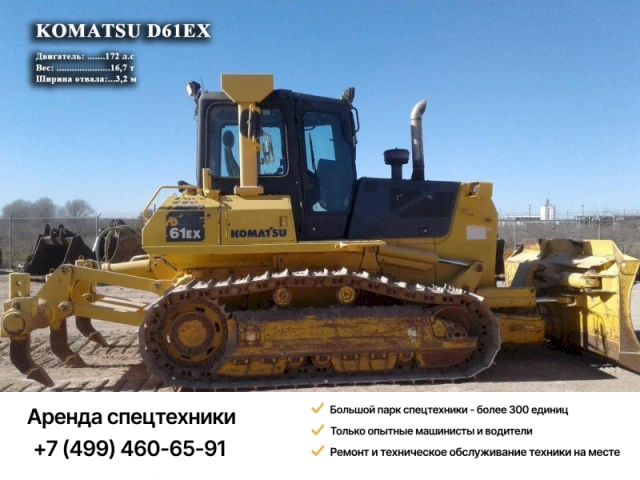 Если вам необходимо взять в аренду бульдозер Komatsu D61EX с машинистом, обращайтесь в нашу организацию. Для выполнения других работ вы можете заказать автогрейдеры, виброкатки, самосвалы.