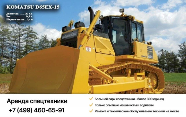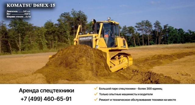 Взять в аренду бульдозер Komatsu D65EX-15 с машинистом, можно в нашей компании. Аренда бульдозера Komatsu D65EX-15 оформляется с экипажем и топливом на минимальный срок 8 часов. У нас имеется возможность предоставить в аренду также другую строительную и специальную технику – экскаваторы, погрузчики, виброкатки и т. п.