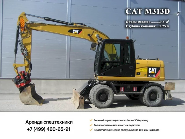 Наша компания предлагаем аренду колесного экскаватора CAT M313D. Машина оснащается мощным двигателем, отличается большой глубиной копания, имеет высокую грузоподъемность, легкое управление и сокращенное число рабочих циклов.