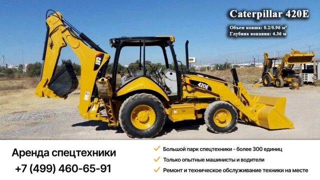 Машина 420E отличается простотой управления, снижающей утомляемость и повышающей КПД оператора. По техническим характеристикам модели серии «E» относятся к усовершенствованным версиям CAT с более агрессивным копанием и повышенной производительностью погрузчика. Мощность дизельного двигателя 420Е (серия 3054C DIT, с турбонадувом) — 102 л.с. Глубина копания модели — 4,36 м. Объем ковша — 0,2 м3. Максимальная скорость движения — 40 км/ч.