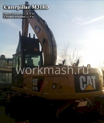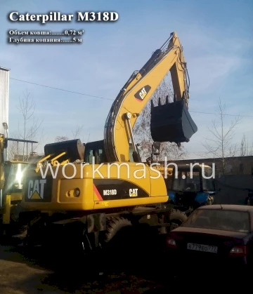 Колесный экскаватор CAT 318 оснащен стандартным ковшом, объемом 0,72 м3, длина стрелы позволяет выполнять разработку грунта на глубине до 5 м.