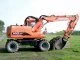 Колесный экскаватор Doosan DX140WV обеспечивает копание грунтов разной твердости на максимальную глубину 5,54 м и выгрузку породы на высоту до 8 м. Для разработки грунта используется небольшой ковш емкостью 0,65 м3. При потребности может устанавливаться планировочный, траншейный или грейферный ковш.