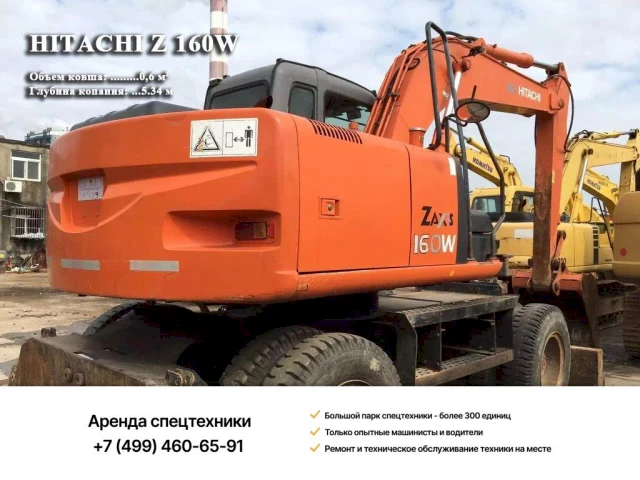 Гидравлический 15,7-тонный экскаватор ZX 160W построен на основе двухосного шасси на колесах, приводимого в действие дизельным мотором мощностью 122 л.с. Двигатель поддерживает функционирование гидравлического привода стрелы, разрабатывающей грунт на глубину до 5,34 м. Выгрузка может совершаться на высоту 6,35 м. Рытье мягкой и твердой породы обеспечивает 0,6-кубовый ковш (можно менять на планировочный, грейферный или траншейный).