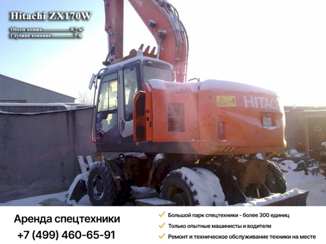 Сдаем колесный экскаватор Hitachi ZX170W в аренду. Улучшенные эксплуатационные характеристики данной техники делают ее незаменимой на любой строительной площадке.