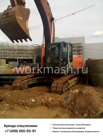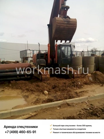 Есть гусеничный экскаватор Hitachi ZX250LCH, оборудованный ковшом, вместимость 1 м3. Его аренда в Москве стоит 14000 рублей за восьмичасовую смену с водителем и топливом. Стоимость доставки на объекты, расположенные в пределах МКАД, - 25000 рублей в одну сторону. При необходимости, на этот экскаватор может быть установлен гидромолот. В этом случае, цена аренды за смену увеличится на 10%. Для согласования срока найма, времени подачи и формы оплаты, звоните нашему менеджеру.