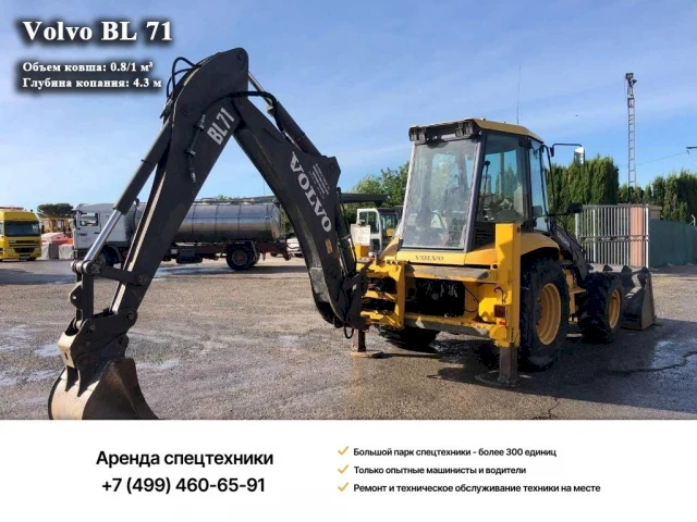 Глубина компания модели — 4,3 м. Мощность 4-х цилиндрового двигателя — 94 л. с. Габаритные размеры (5825х2300х3706 мм) позволяют применять спецтехнику в стесненных обстоятельствах. Гидравлическая система эффективно обслуживает переднее и заднее навесное оборудование. При изготовлении шасси применялась усиленная колесная база. Объем погрузочного ковша — 1 м3. Последний оснащен защитной системой от перегрузок. Преимущество BL 71 — низкий расход топлива. Арендованный экскаватор-погрузчик поставляется по Москве и Московской области.