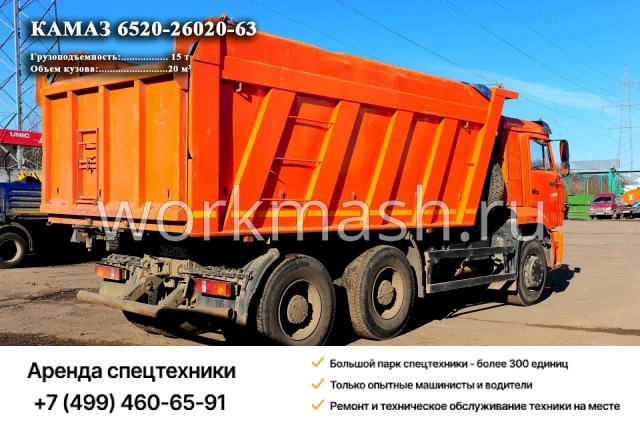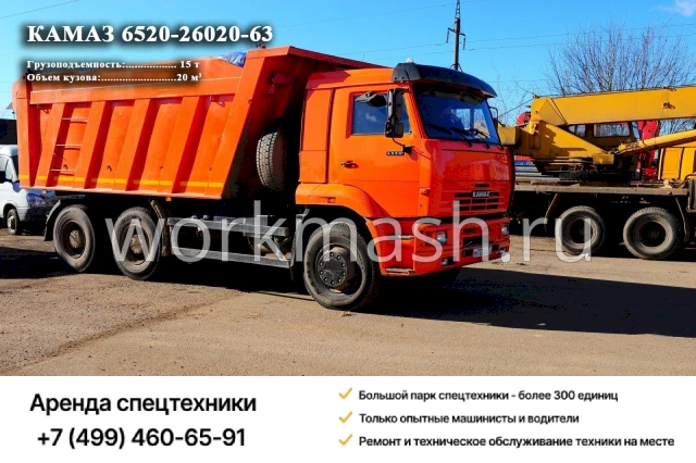 Тут есть следующий нюанс: нагрузка на ось при передвижении по общедоступным дорогам. Поэтому Камаз на 20 куб. м. в любом случае может загрузить не более 12 т., хотя непосредственно при передвижении на самом строительном объекте может доходить до 15 т. Если данное условие вас устраивает, мы предоставим в аренду самосвал Камаз 6520-26020-63.